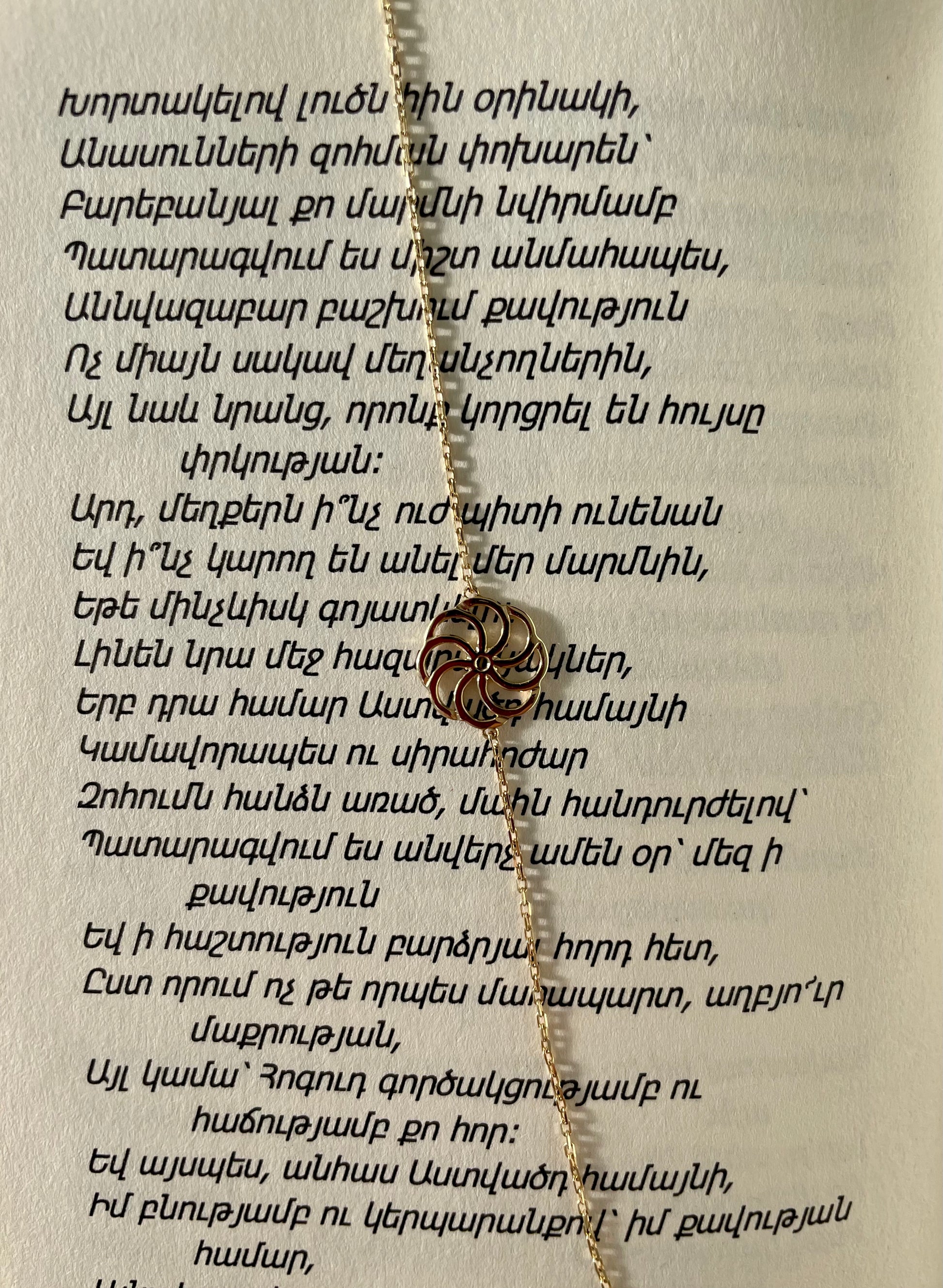 The Armenian eternity sign, also known as the "Arevakhach," is a distinctive symbol in Armenian culture, representing the concept of eternity and the interconnectedness of life. Its intricate design features a continuous loop that forms a timeless and unbroken pattern, symbolizing the eternal nature of existence. Widely used in Armenian art and architecture, this symbol holds deep cultural and spiritual significance, reflecting the enduring spirit and resilience of the Armenian people throughout their history.