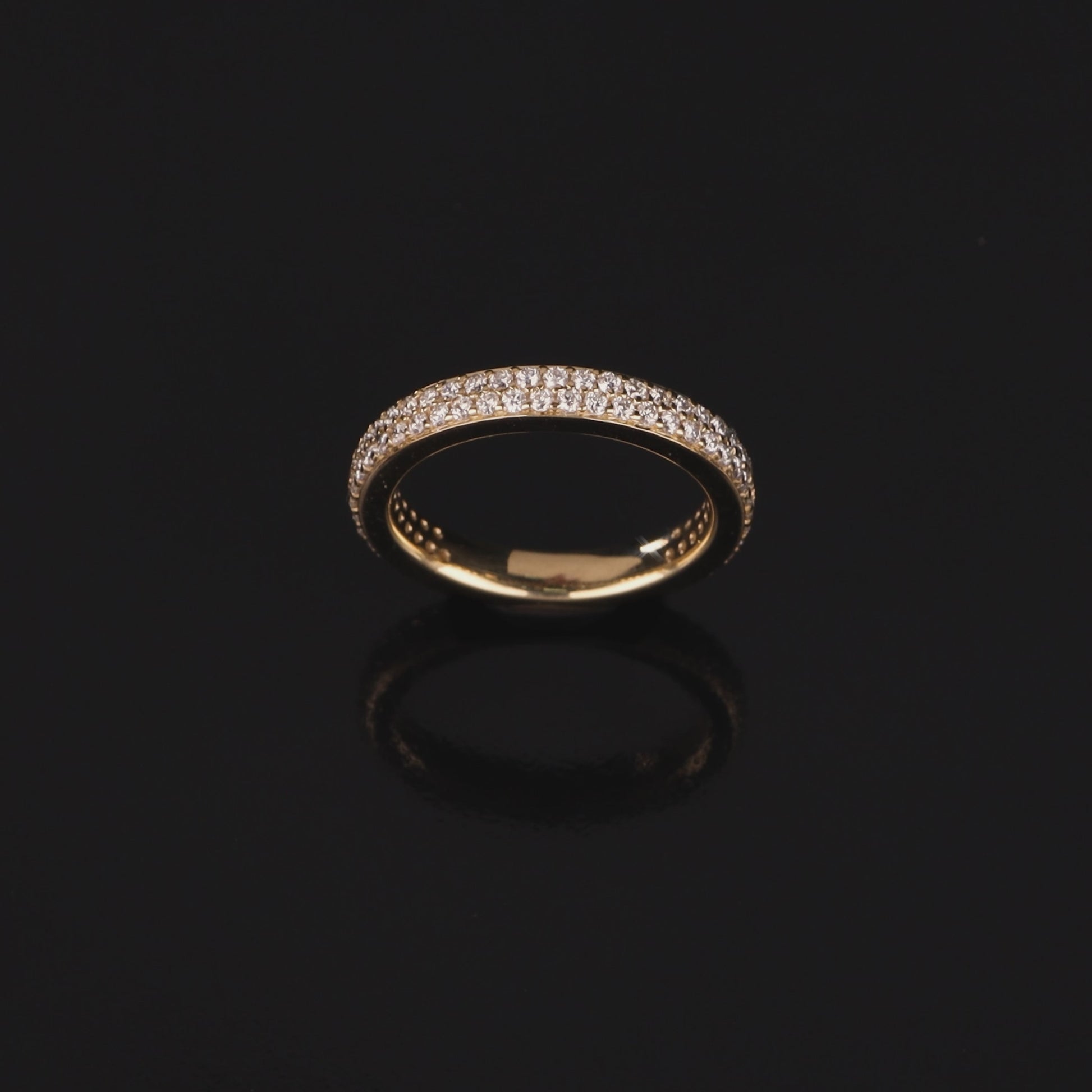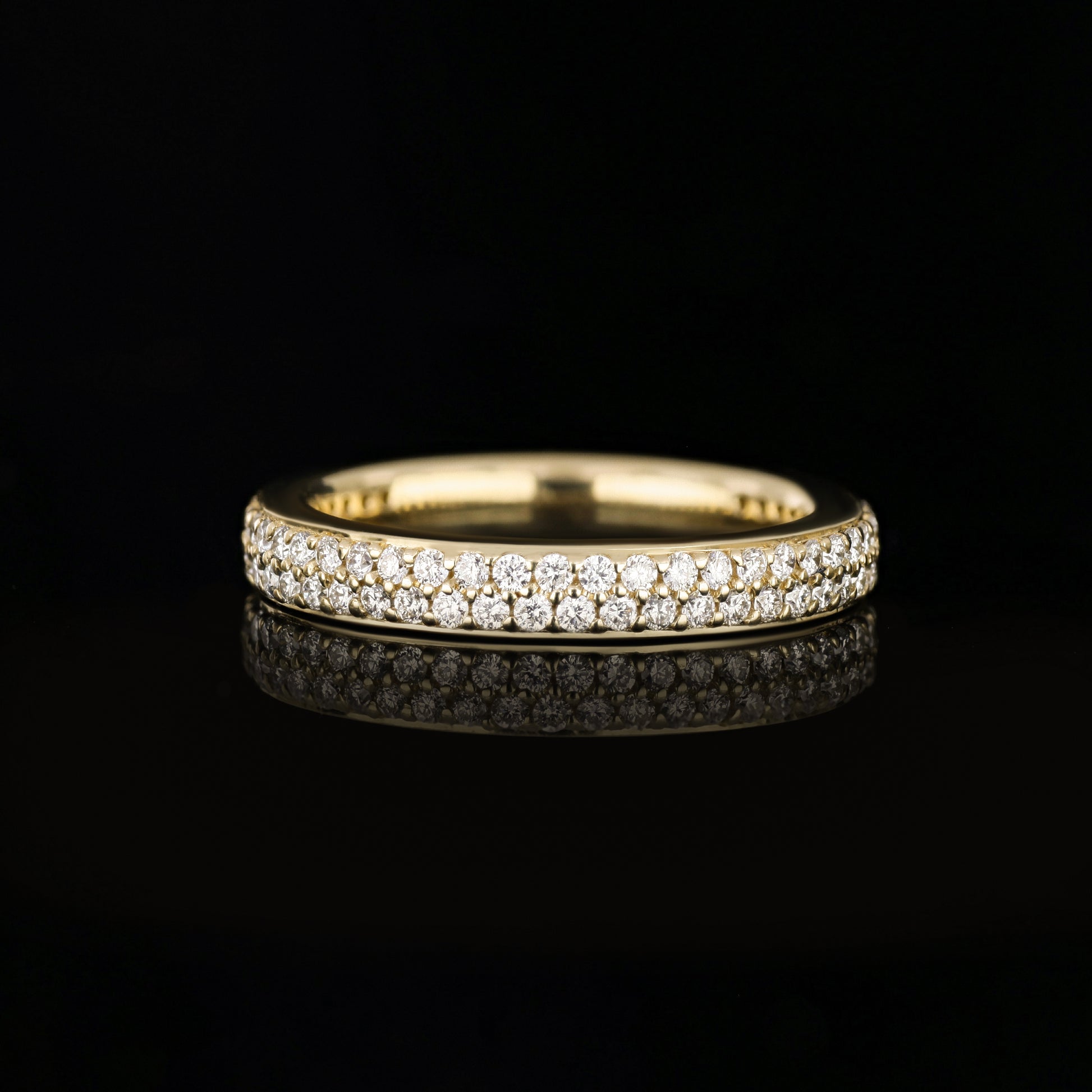 A classic double-row pavé diamond wedding band, crafted in lustrous gold with a shared prong setting for enhanced brilliance. Designed with a comfort fit, this elegant ring is perfect for symbolizing everlasting love.