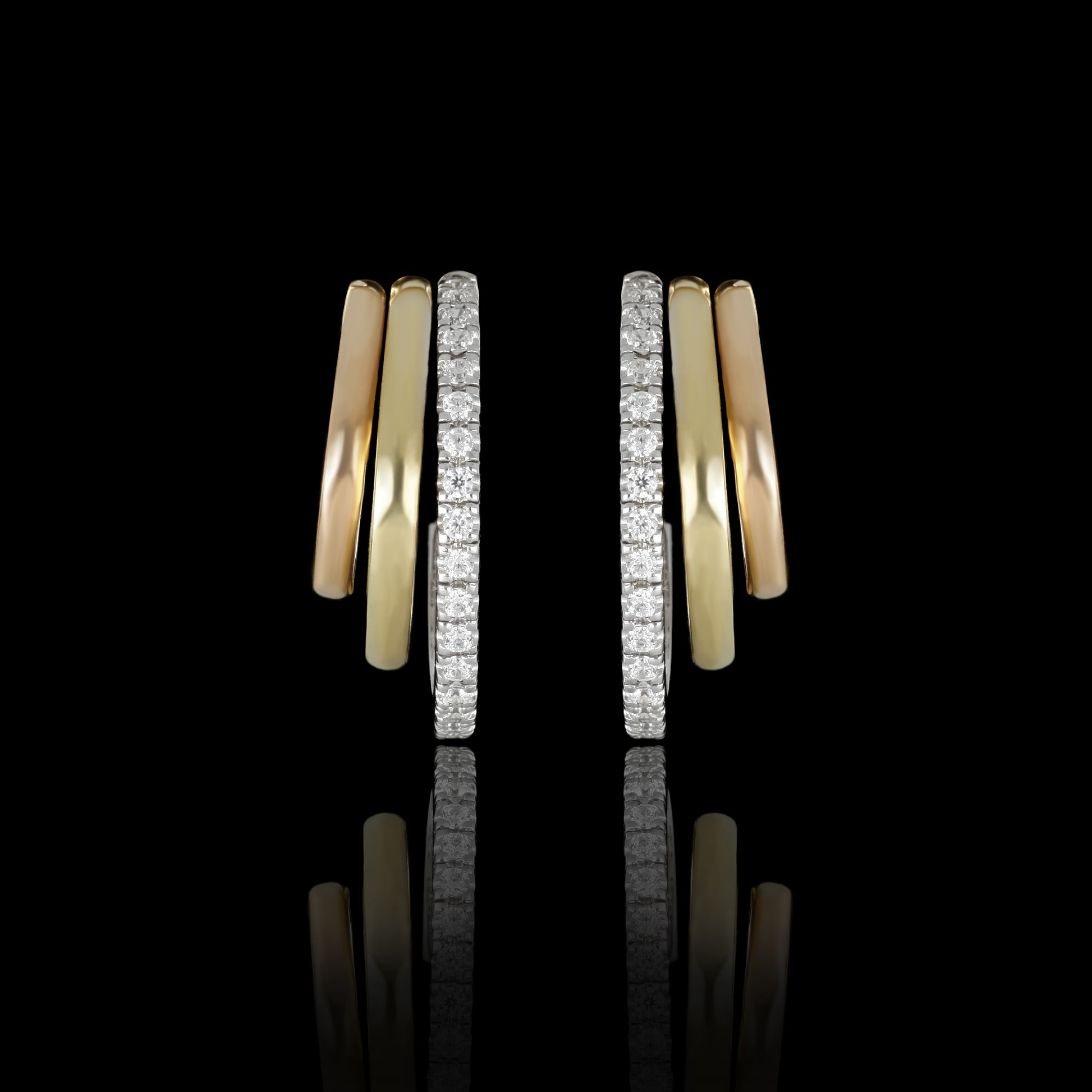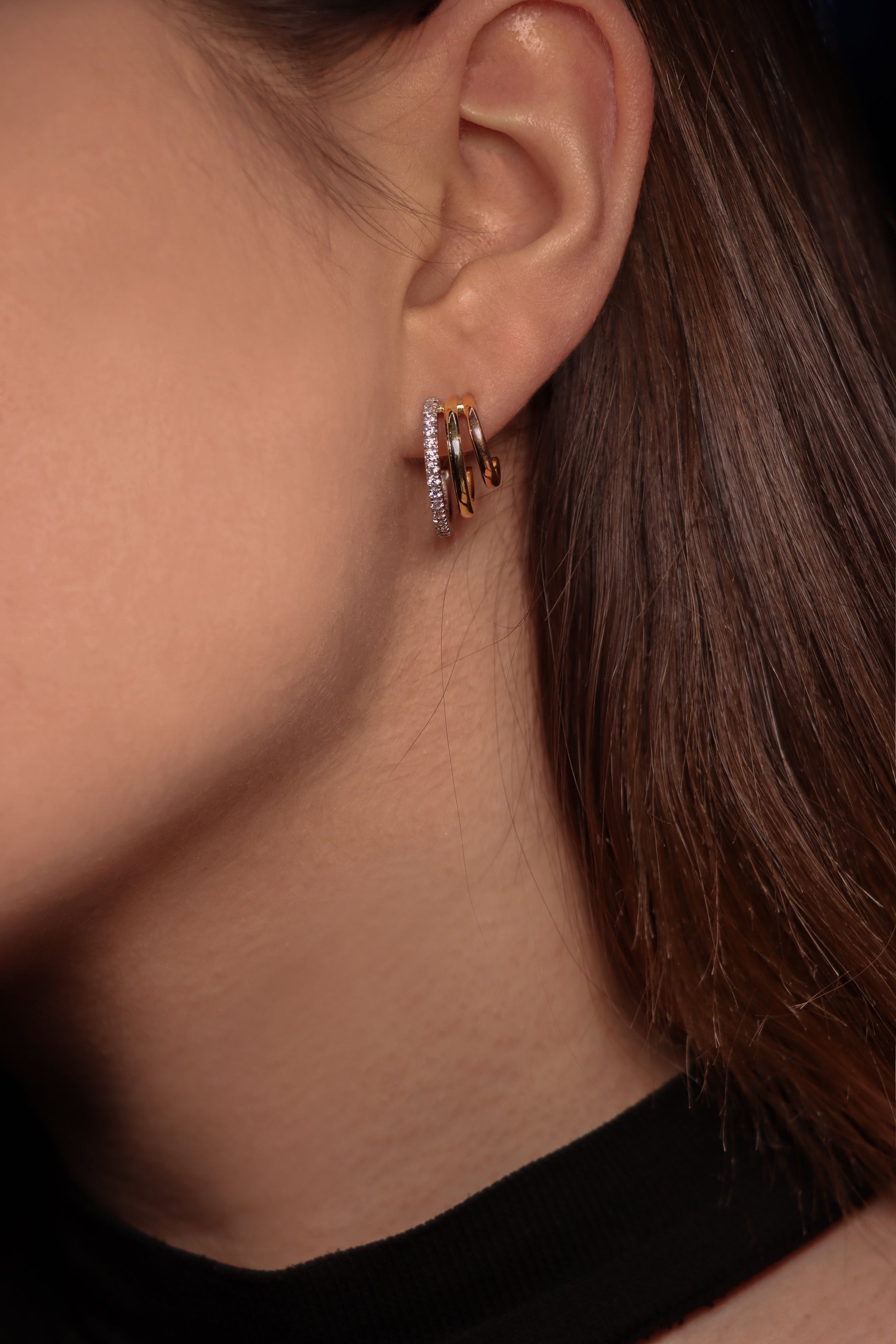 The Mher hoops have the appearance of three earrings but only require one piercing. The largest hoop is white gold with zirconia accents, complemented by smaller yellow and rose gold hoops.