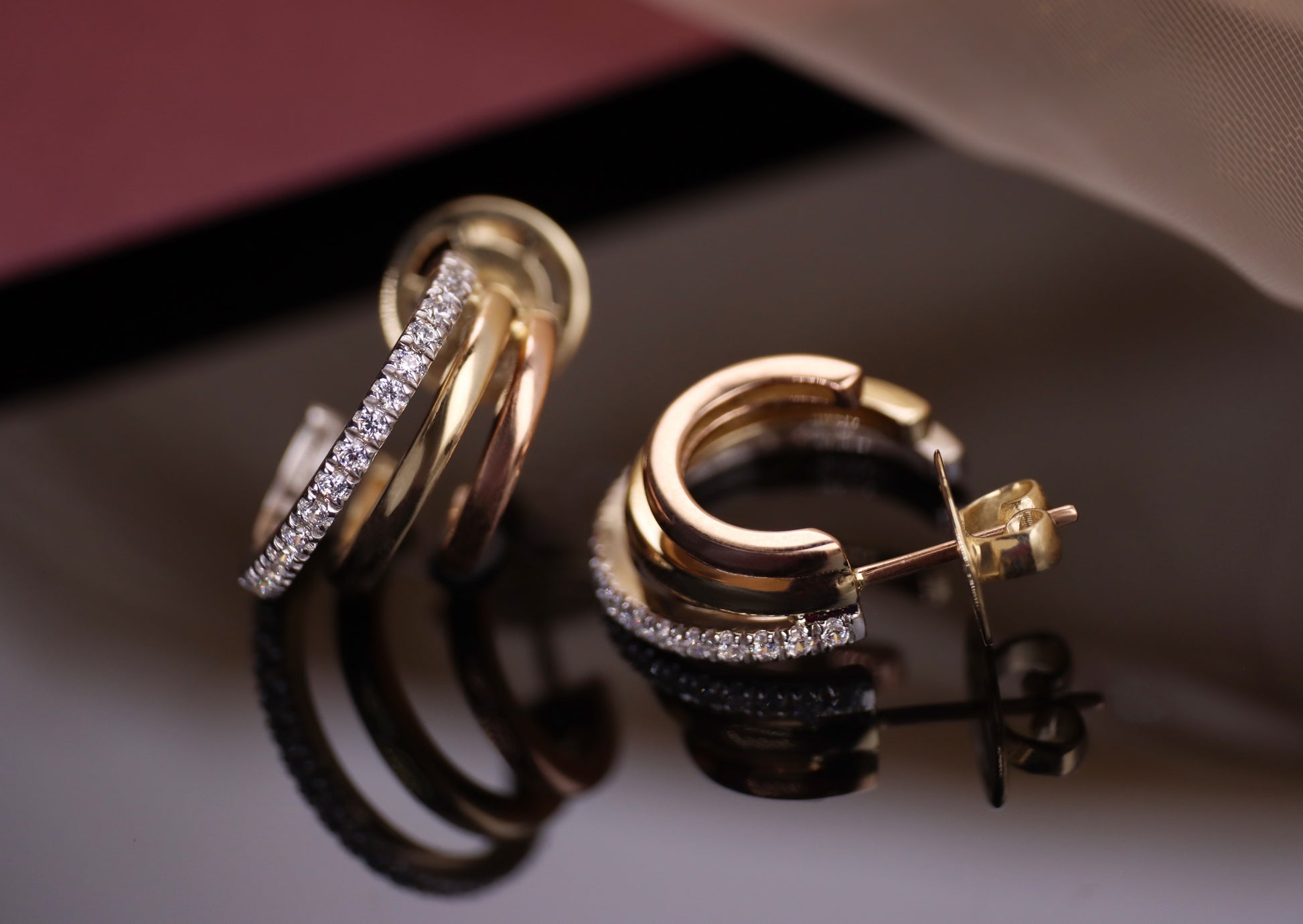 Our Mher earrings are made out of yellow, white, and rose gold, and adorned with zirconia or diamonds.